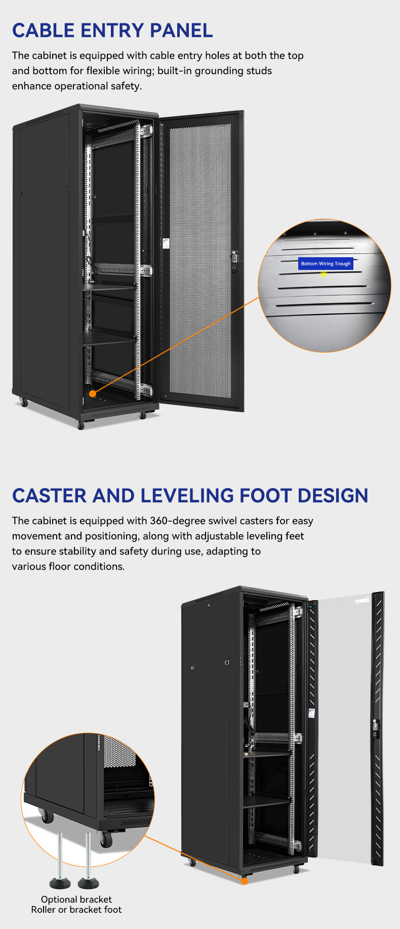 The cabinet is equipped with cable entry holes at both the top and bottom for flexible wiring; built-in grounding studs enhance operational safety.