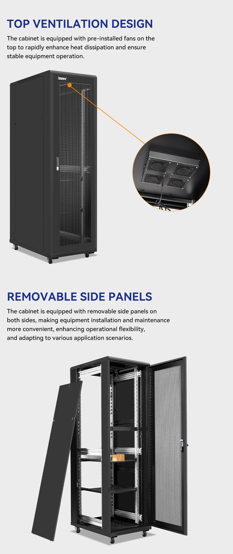 The cabinet is equipped with pre-installed fans on the top to rapidly enhance heat dissipation and ensure stable equipment operation.